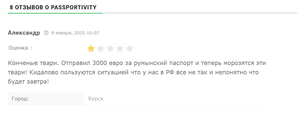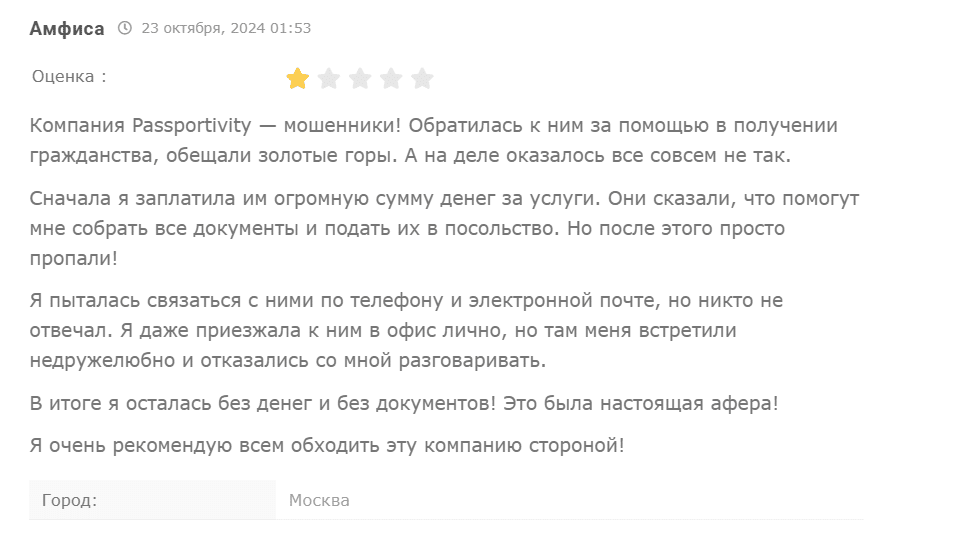Автор этого фейкового отзыва давит на эмоции, но не рассказывает детали: какое гражданство получил, сколько денег потерял, в какой офис приезжал. Связаться с ним и уточнить детали не получилось — на сайте нет такой возможности